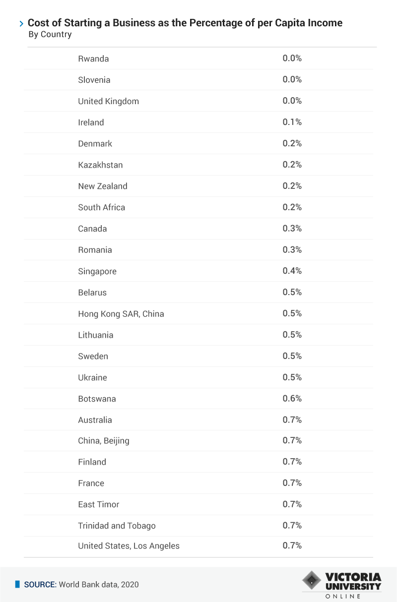 The UK had one of the lowest average startup costs as a percentage of their per capita income. Their per capita income was last recorded in 2019 as $43,688 USD, which actually represents 346% over the world’s average. By comparison, the U.S. per capita income in 2019 was $65,118, but it costs almost seven times a higher percentage of this larger income to start a business in Los Angeles than it does in the UK