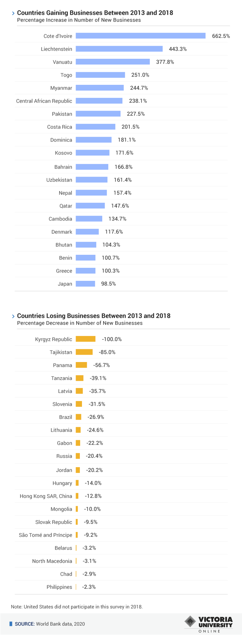In terms of where countries are heading with new business growth, we analyzed the number of new businesses registered by the World Bank in each country in 2013 and calculated the percentage change in 2018. Over the course of five years, Cote d’Ivoire has been rapidly gaining new businesses due to its relatively high median income, despite political upheaval in 2002, and a rapidly expanding economy. Liechtenstein, a tiny country that sits between Switzerland and Austria, has also seen rapid growth of new businesses in the span of five years, welcoming foreign investment and touting a robust private banking sector.
