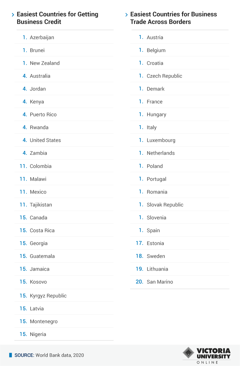 New Zealand, which previously ranked as the overall easiest country for business, also ranked No. 1 for its ability to lend business credit to its entrepreneurs. By comparison, the U.S. and Australia each received a rank of 4 for business lending, while the UK didn’t make the list of top 25 in this regard.