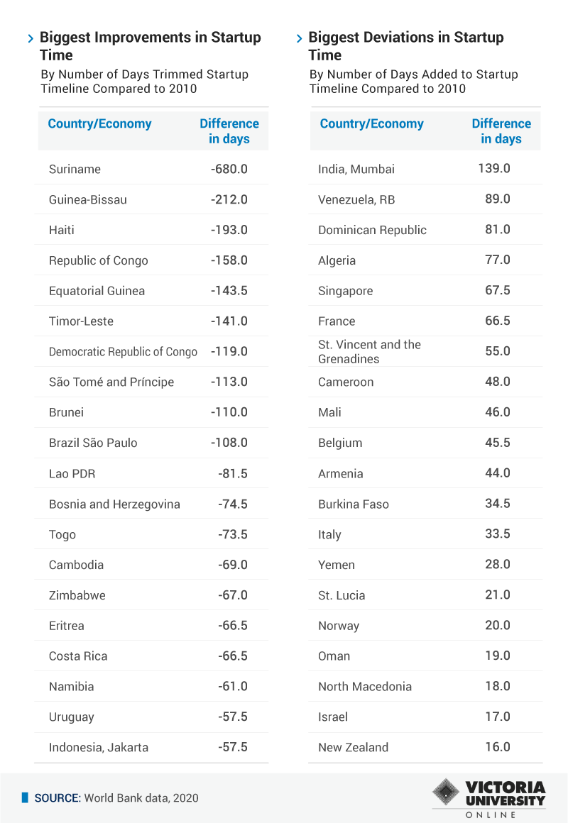 Venezuela again saw a large change in the number of days to secure a startup, adding 89 days, on average, to start a business entity compared to 2010. Until the violence and political unrest between Maduro and Juan Guaidó quells, the entrepreneurial spirit is unlikely to be fostered here. Instead, basic survival will remain the tragic priority. The only other location to add more time to start a business was India’s Mumbai, which is ironically the country’s wealthiest city and its capital of commerce. Culturally, India offers a few barriers to business. Although they have a large venture capital community, they are primarily interested in revamping existing ideas as opposed to funding innovation and creativity. Indian entrepreneurs also discuss getting limited support from their families, while the World Bank mentions their slow court processes, miles of red tape, and even difficulty getting electricity in an office as major barriers to local startups.