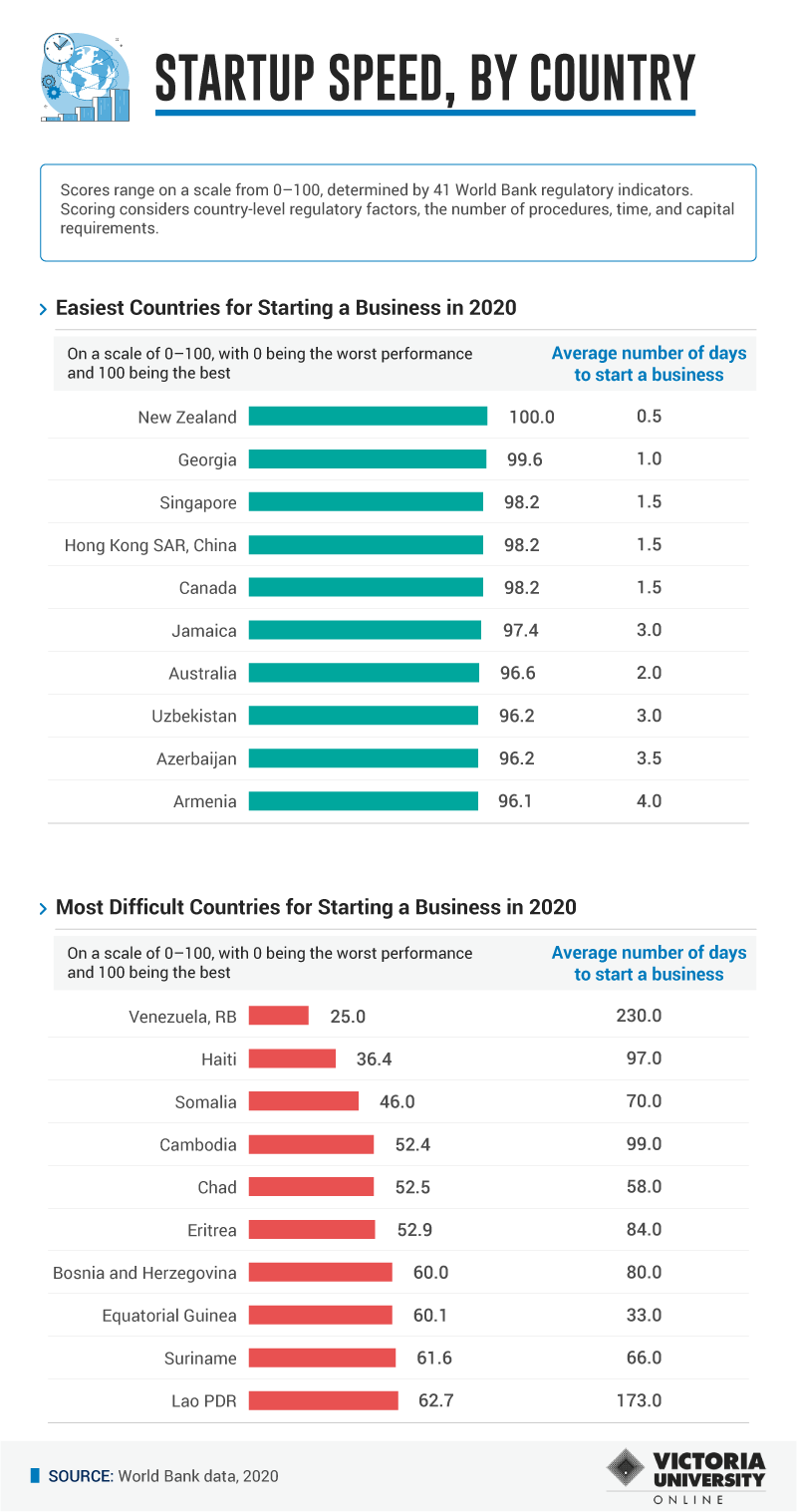 Based on the World Bank meta ranking, New Zealand is the No. 1 easiest country in which to start a business. This sentiment is echoed by the government on New Zealand’s website, where plenty of helpful resources, like local authority rules and accountant referrals, encourage other local entrepreneurs to take advantage. On average, it takes just half of one day to start a new business in New Zealand. This country may also currently be easiest to maintain an existing business, as it has received much praise as the “emblematic champion” of how to properly deal with the COVID-19 outbreak, which notoriously destroyed many existing businesses in other countries.